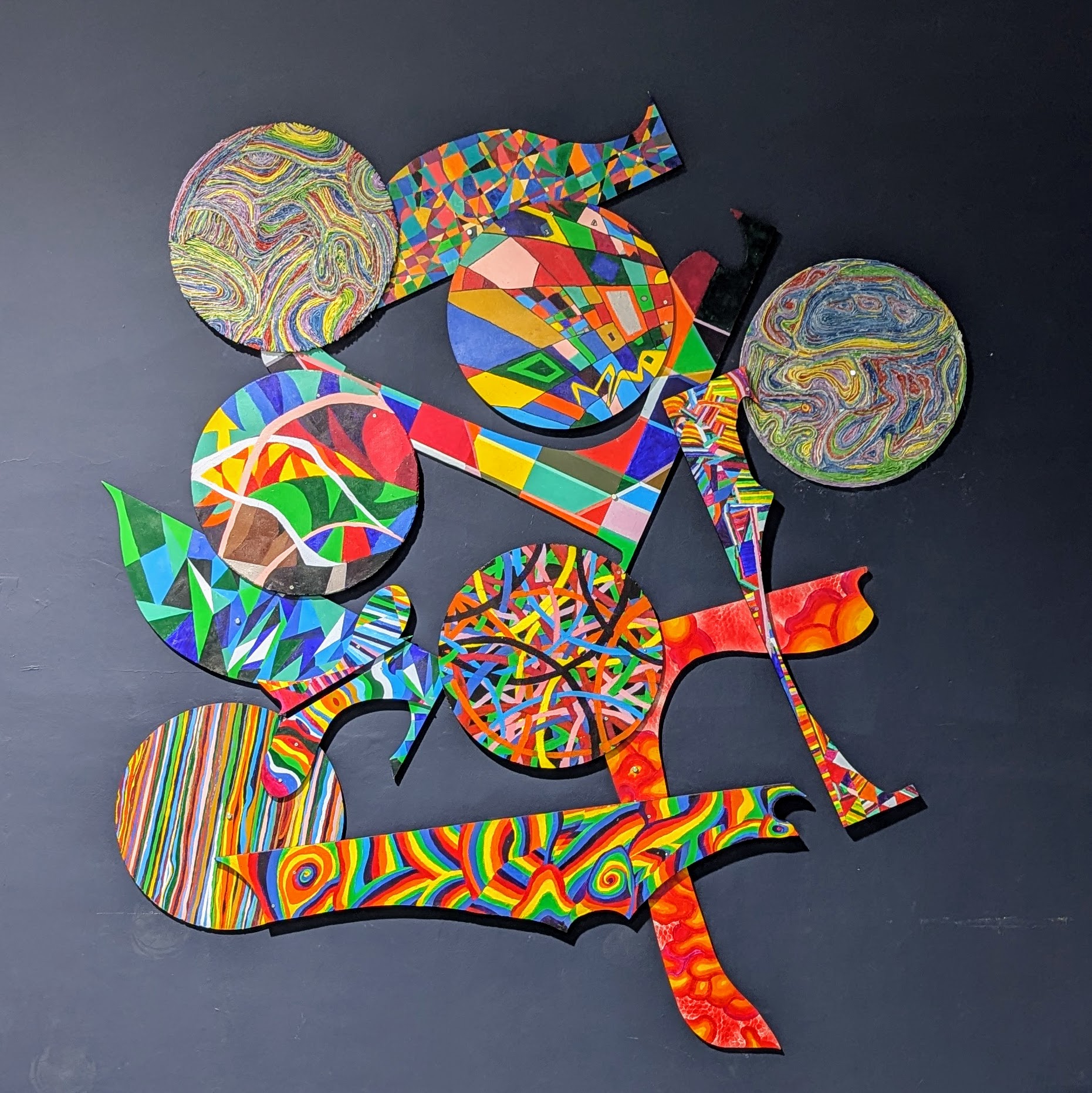 Αφού συζητήθηκαν ο ρόλος και η χρησιμότητα των διακοσμητικών μοτίβων σε αντιδιαστολή με των αποδομημένων εικαστικών μοτίβων, αξιοποιήσαμε στο δεύτερο και τελευταίο μέρος της ενότητας περισσεύματα ξύλων από άλλες εργασίες και με χρήση ακρυλικών και καλωδίων τα παιδιά εργάστηκαν ομαδικά για τη δημιουργία έργων αποδομημένων μοτίβων. Σε κάθε τμήμα τα παιδιά εργάστηκαν ατομικά και η επιλογή για το ομαδικό έργο του τμήματος αποφασίστηκε μετά από ψηφοφορία. Στη συνέχεια, τα ομαδικά έργα του κάθε τμήματος αποτέλεσαν στοιχεία μιας μεγαλύτερης σύνθεσης-εγκατάστασης που κοσμεί πια μόνιμα την αίθουσα πολλαπλής χρήσης του σχολείου μας.